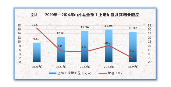 全年全县全部工业增加值14.92亿元,比上年下降5.1%。规模以上工业增加值下降12.6%。在规模以上工业中,分行业看,采矿业增加值下降10.8%,酒、饮料和精制茶制造业增长32.3%,医药制造业下降1.6%,黑色金属冶炼及压延加工业下降81.8%,有色金属冶炼和压延加工业增长32.3%,橡胶和塑料制品业下降6.2%,非金属矿物制品业下降3.4%,电力、热力、燃气及水的生产和供应业下降14.8%。分轻重工业看,轻工业增长14.3%,重工业下降14.7%。