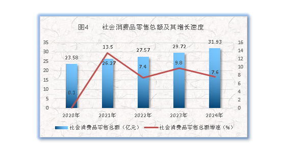 全年全县社会消费品零售总额31.93亿元,比上年增长7.6%,按经营地统计,城镇消费品零售额26.67亿元,增长7.5%;乡村消费品零售额5.26亿元,增长7.9%。按消费形态统计,商品零售额26.24亿元,增长6.7%;餐饮收入5.69亿元,增长12.6%。