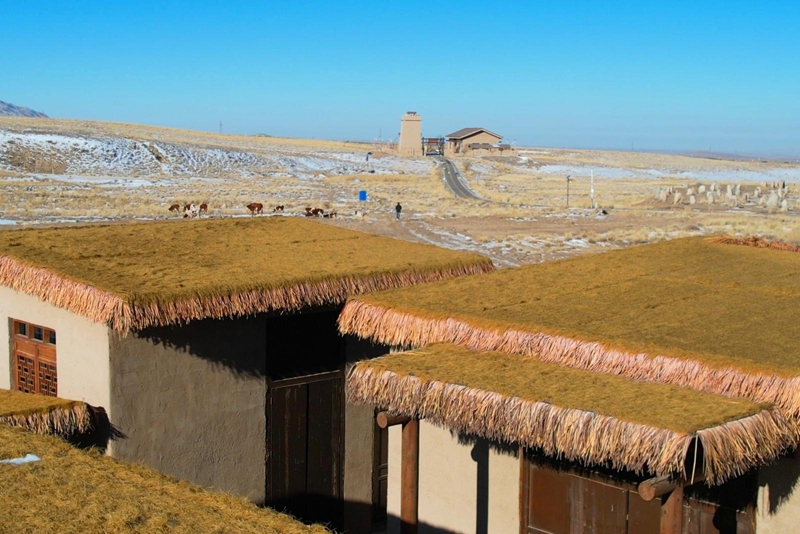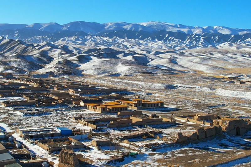 远处祁连雪峰连绵如练,近处坡地雪痕与枯茎交织,新旧屋舍错落于苍茫之间。