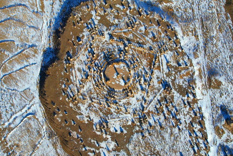 11月24日,新雪轻覆山丹硖口村,古堡残垣的苍赭裹上素白绒衣。