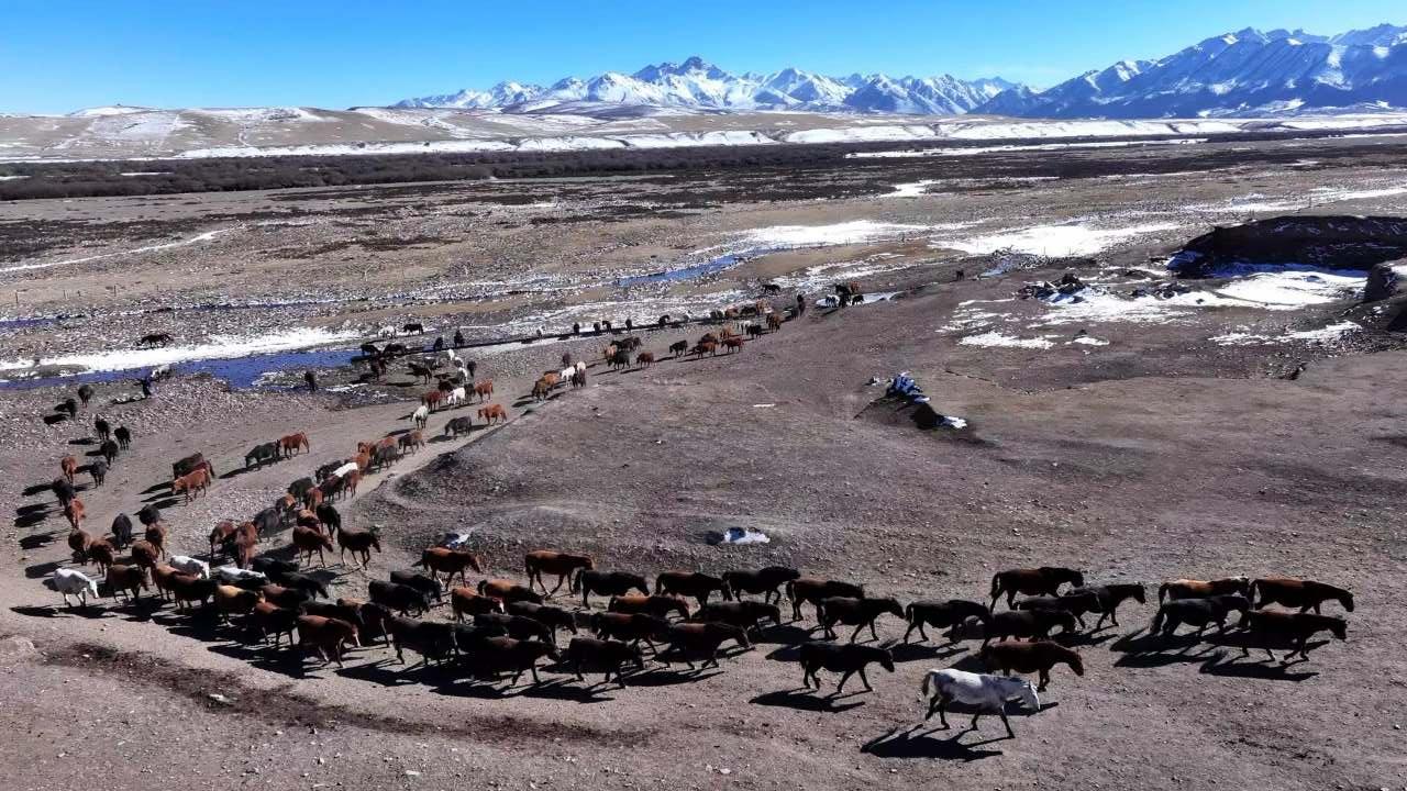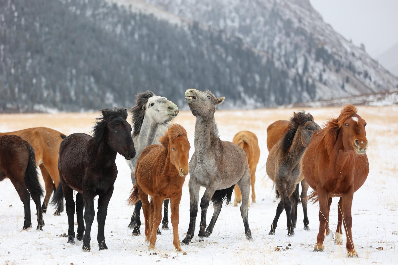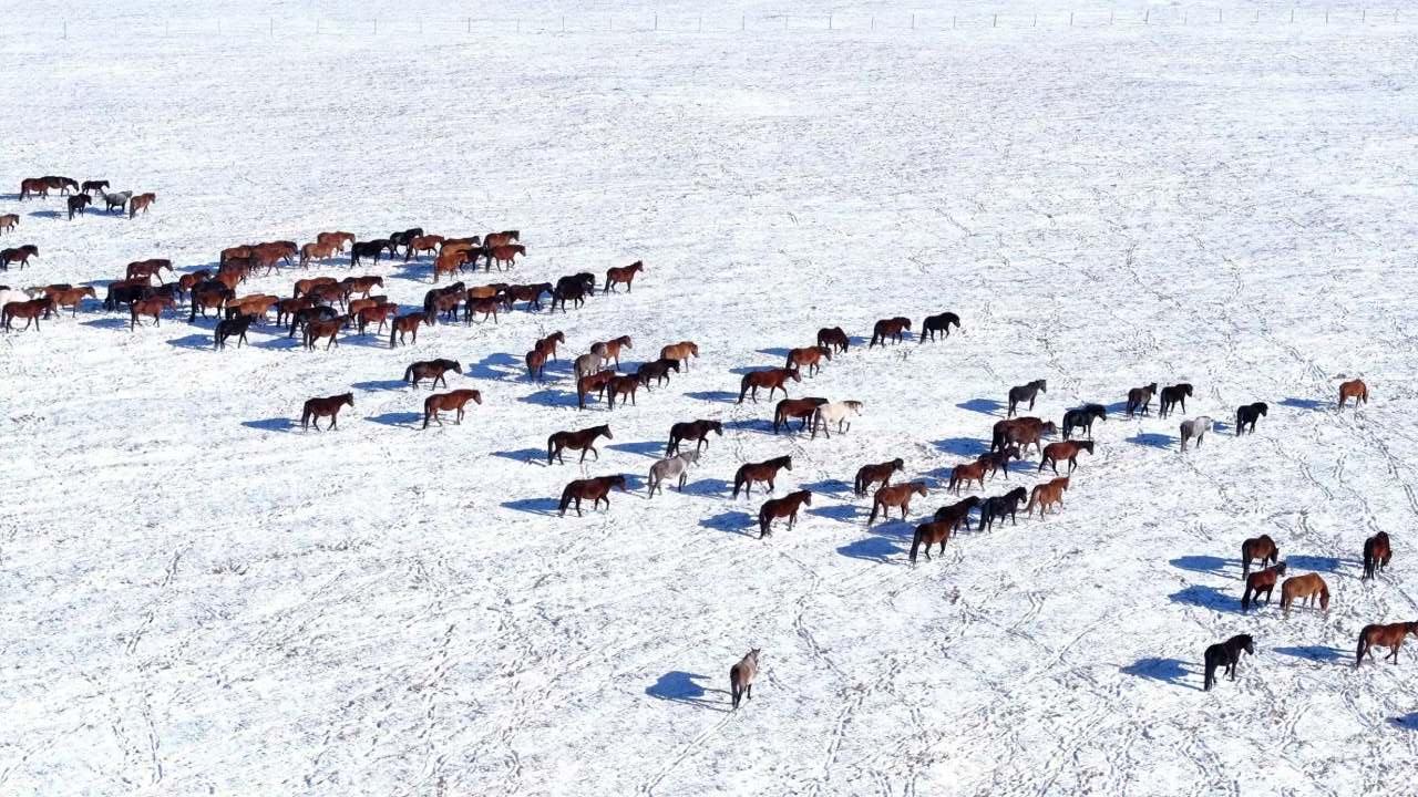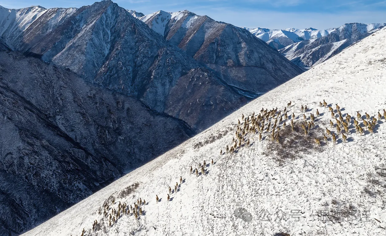 马群与岩羊悠然踏雪、觅食,为寂静的草场添上生机。