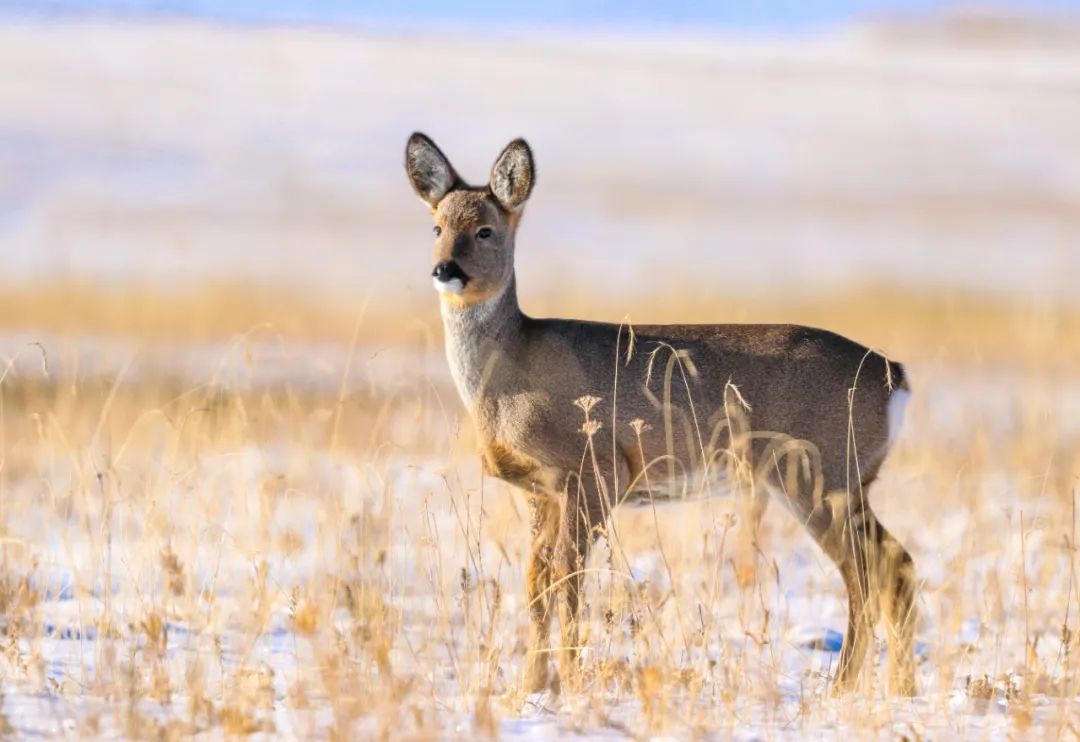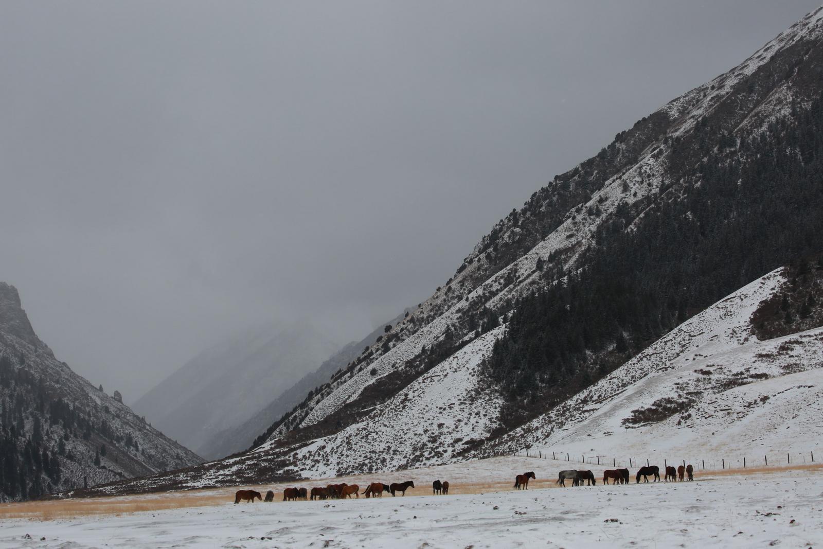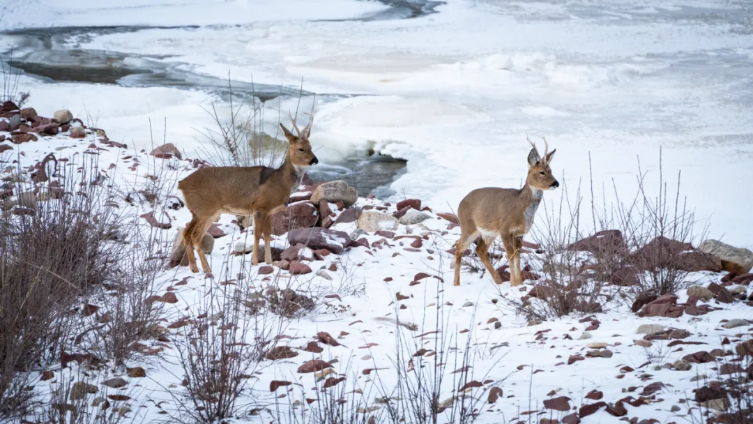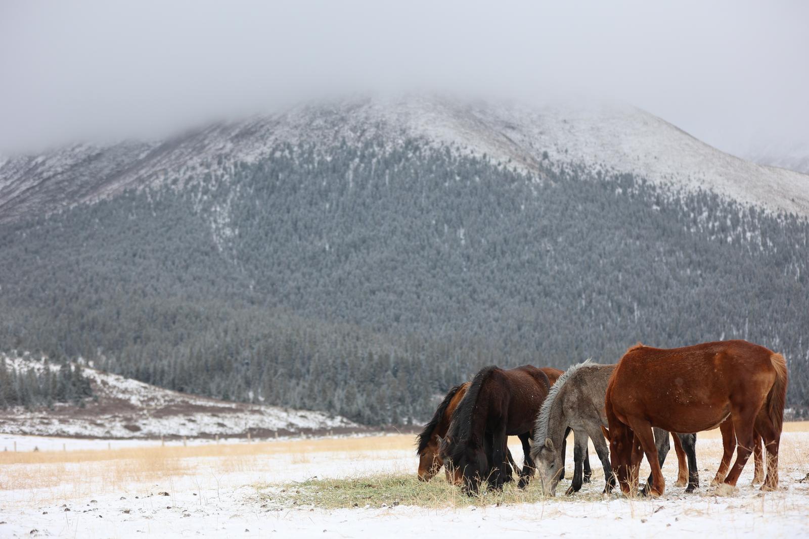 马群与岩羊悠然踏雪、觅食,为寂静的草场添上生机。