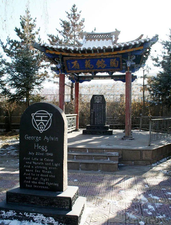 中间是甘肃省政府矗立的大理石碑一座,上面镌刻着路易•艾黎和他的好友乔治•何克的生平简介。他生于1915年,逝世于1945年,是英国人。曾在中国生活、工作近7年。他同情和支持中国的进步事业,与路易•艾黎一起创办了培黎工艺学校。1945年7月,在学校任教期间不幸以身殉职,年仅30岁,为纪念好友,艾黎将何克葬于山丹河北岸,培校校办工厂院内。1979年重建何克陵墓,1985年省政府又拨款重修何克陵园。1987年12月,艾黎逝世后,骨灰于1988年4月安放在何克陵园内,所以又更名为“艾黎与何克陵园”。园内苍松翠柏,郁郁葱葱,庄严肃穆。