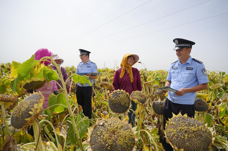 金秋九月,祁连山北麓的甘肃山丹县迎来大麦、葵花、土豆等农作物丰收季。为保障农作物顺利归仓,山丹县公安局紧扣戈壁绿洲农时特点,将警务工作延伸到田间地头,从巡防守护、纠纷调解、安全宣传等方面精准发力,用“警察蓝”守护“丰收景”,为秋收生产筑牢安全屏障。