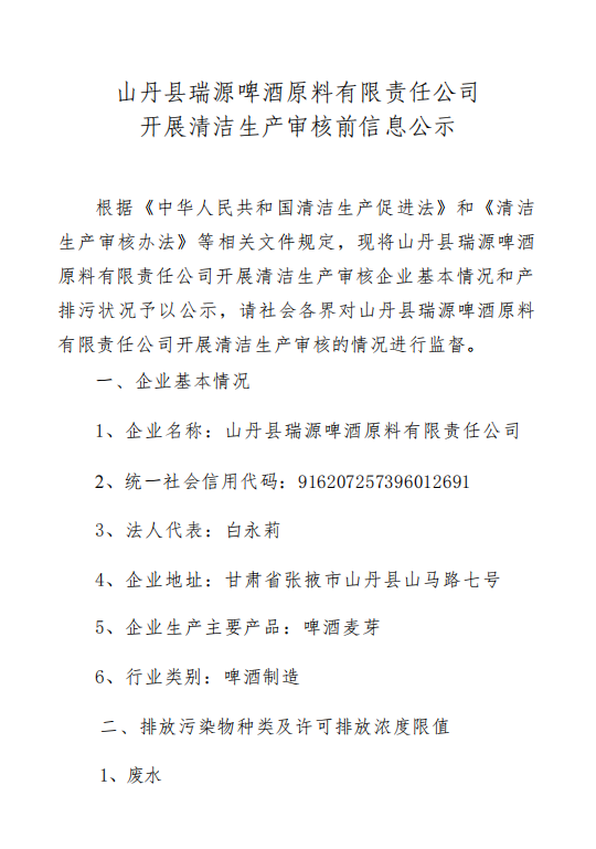 山丹县瑞源啤酒原料有限责任公司开展清洁生产审核前信息公示