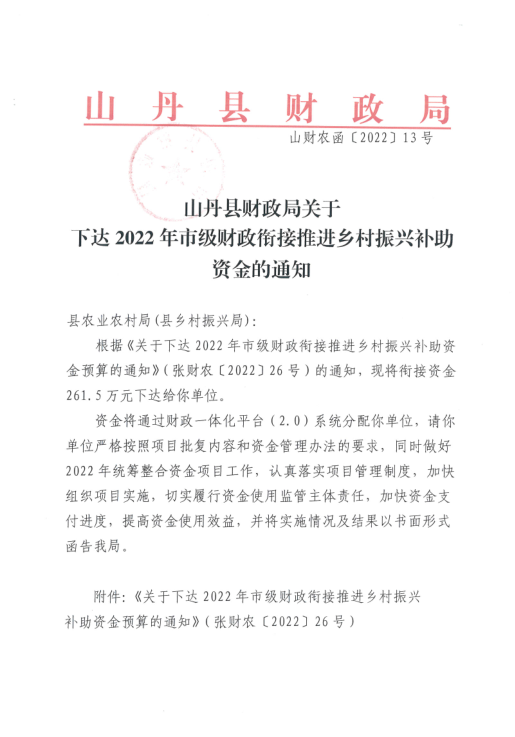 山丹县财政局关于下达2022年市级财政衔接推进乡村振兴补助资金的通知