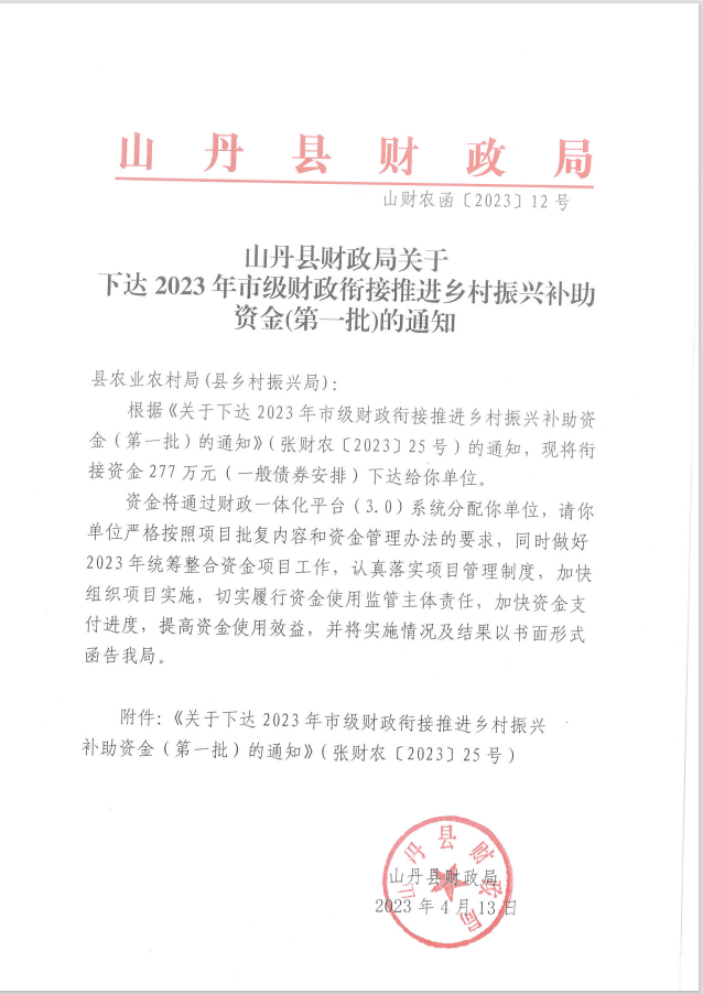 山丹县财政局关于下达2023年市级财政衔接推进乡村振兴补助资金(第一批)的通知