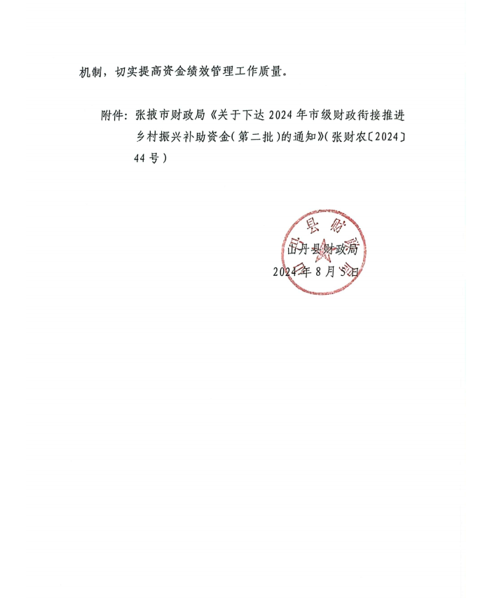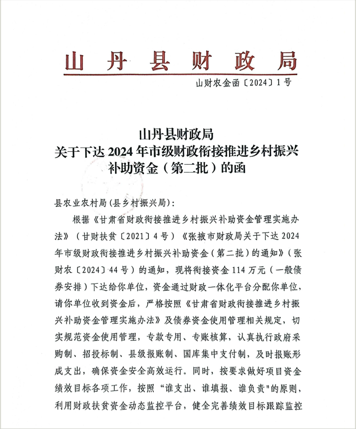 山财农金函〔2024〕1号山丹县财政局关于下达2024年市级财政衔接推进乡村补助资金(第二批)的函)