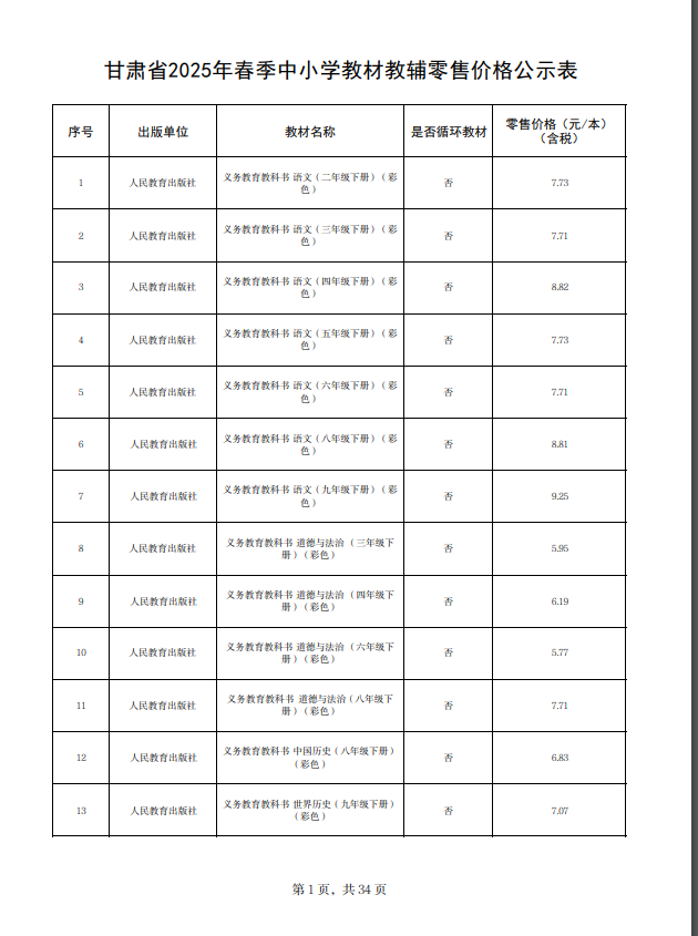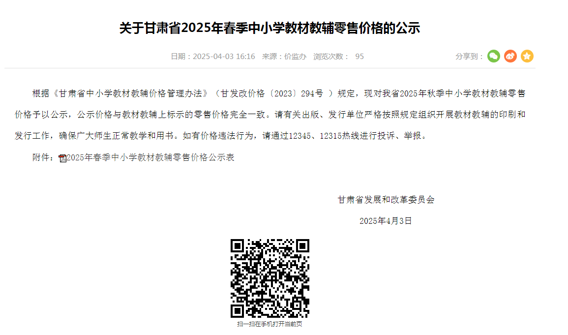 关于甘肃省2025年春季中小学教材教辅零售价格的公示
