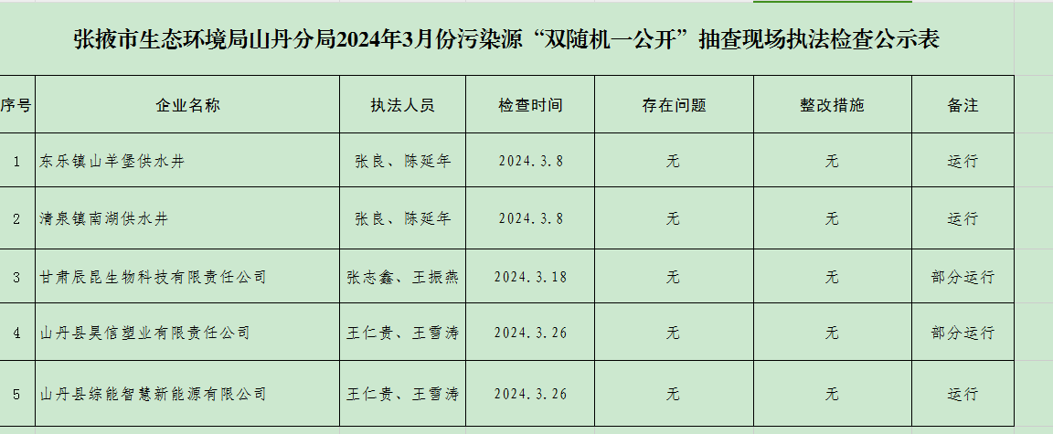 张掖市生态环境局山丹分局关于2024年3月份污染源“双随机、一公开”抽查现场执法检查情况的公示