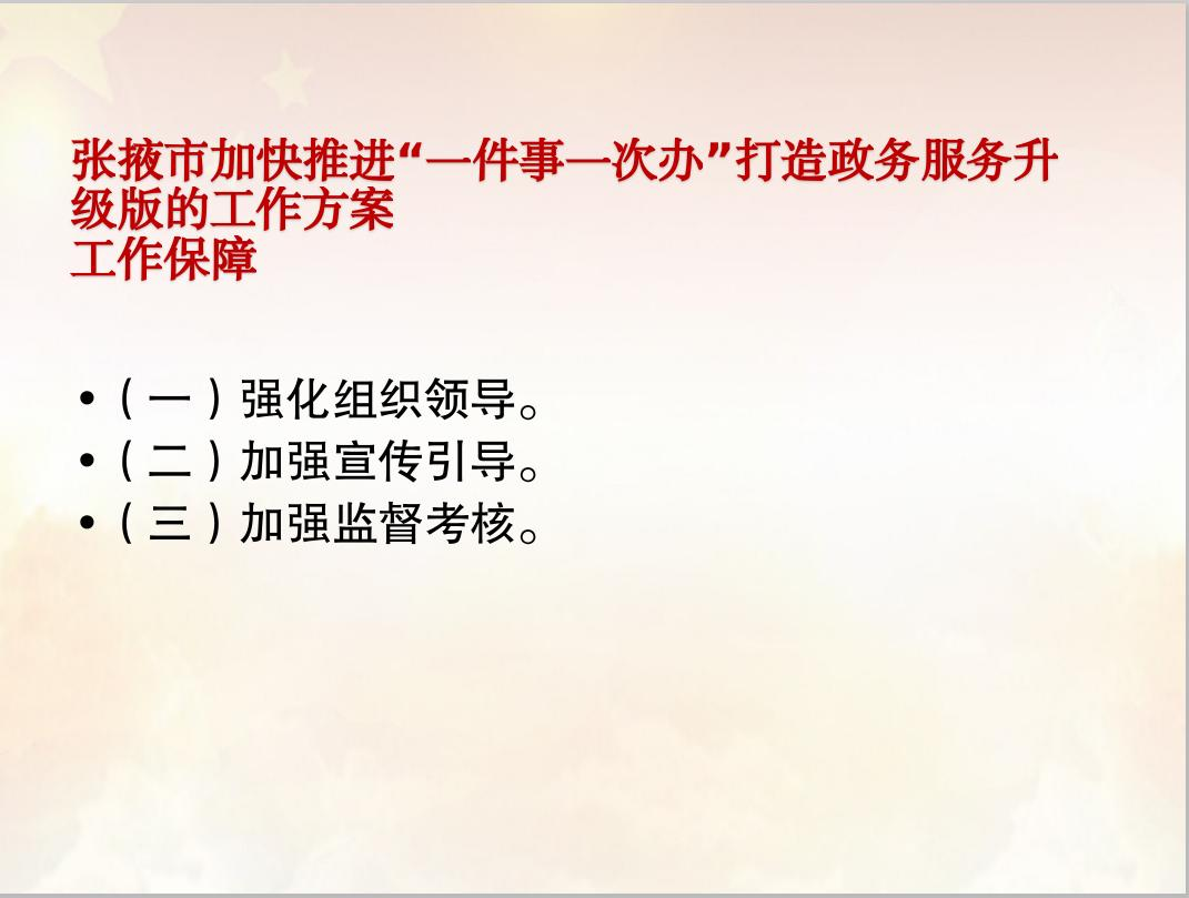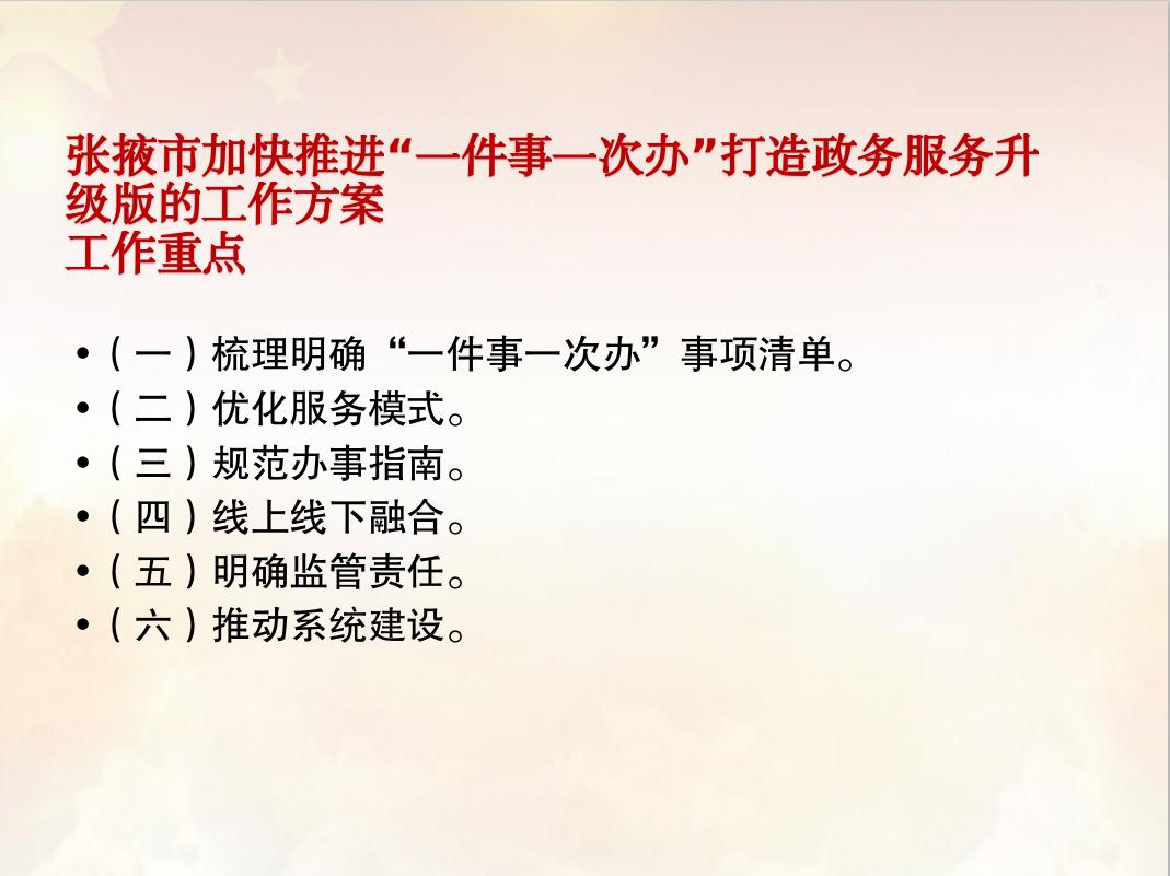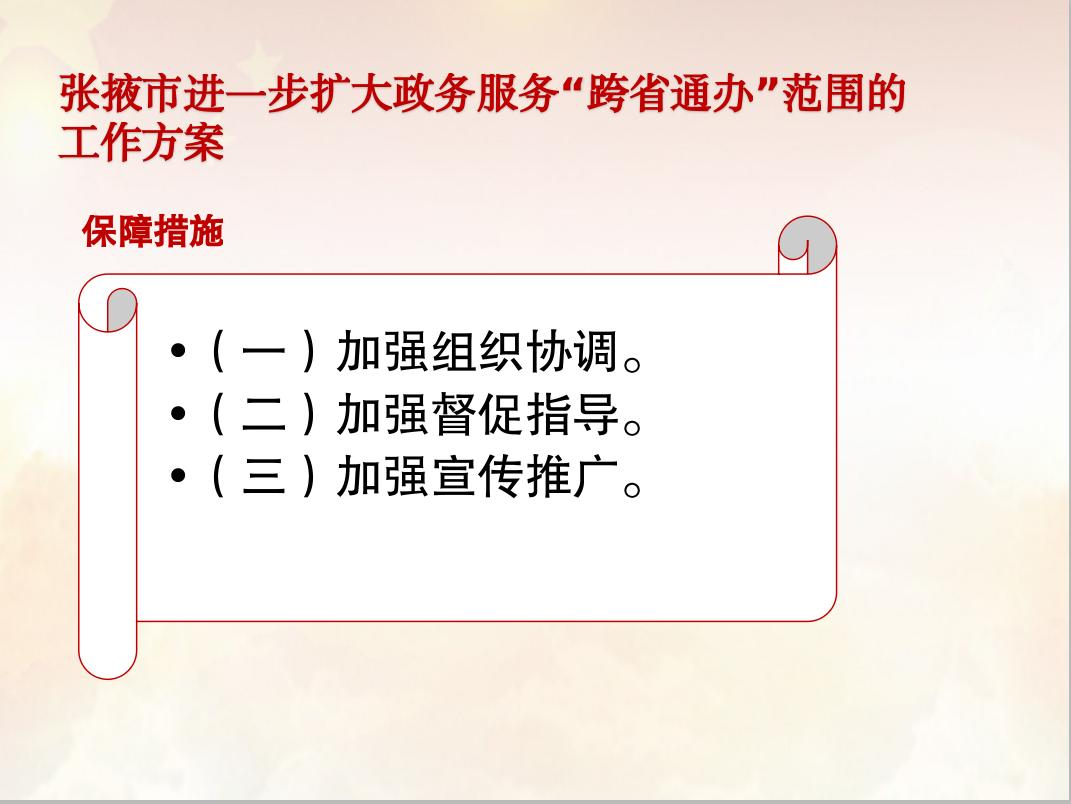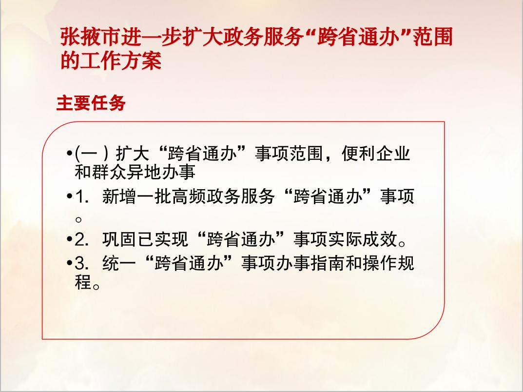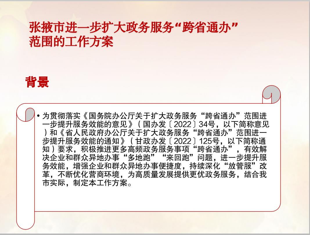 相关解读文件:张掖市人民政府办公室关于印发张掖市进一步扩大政务服务“跨省通办”范围的工作方案和张掖市加快推进“一件事一次办”打造政务服务升级版的工作方案的通知