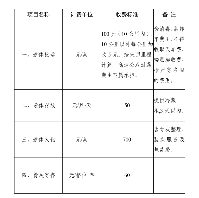 (一)殡葬基本服务收费:遗体接运100元/具;遗体存放50元/具·天;遗体火化700元/具;骨灰寄存60元/格位·年。