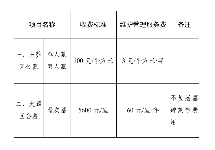 (二)公墓墓位费和公墓维护管理服务费:土葬区单人墓、双人墓均为100元/平方米、维护管理服务费3元/平方米·年;火葬区公墓5600元/座、维护管理服务费60元/座·年。