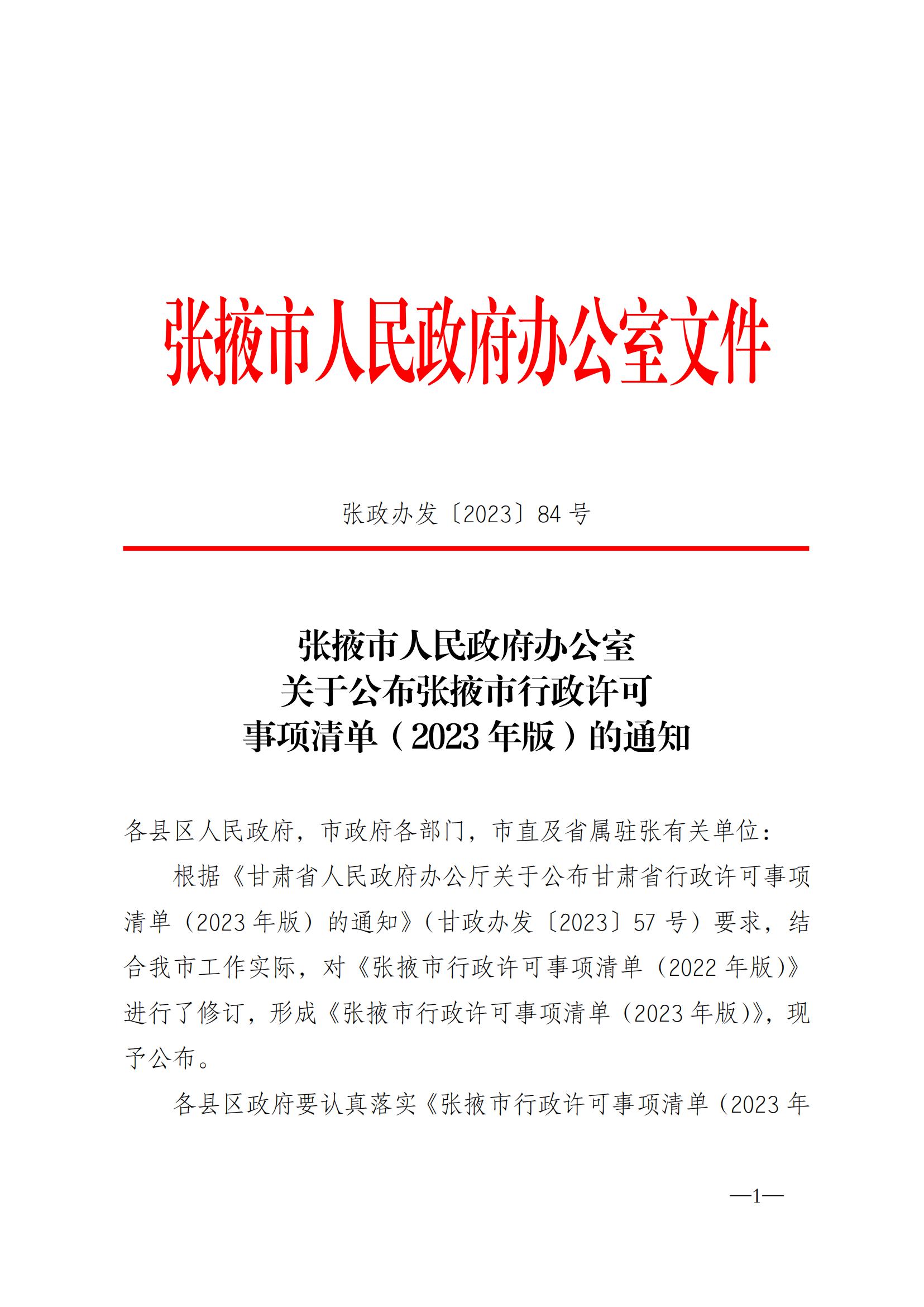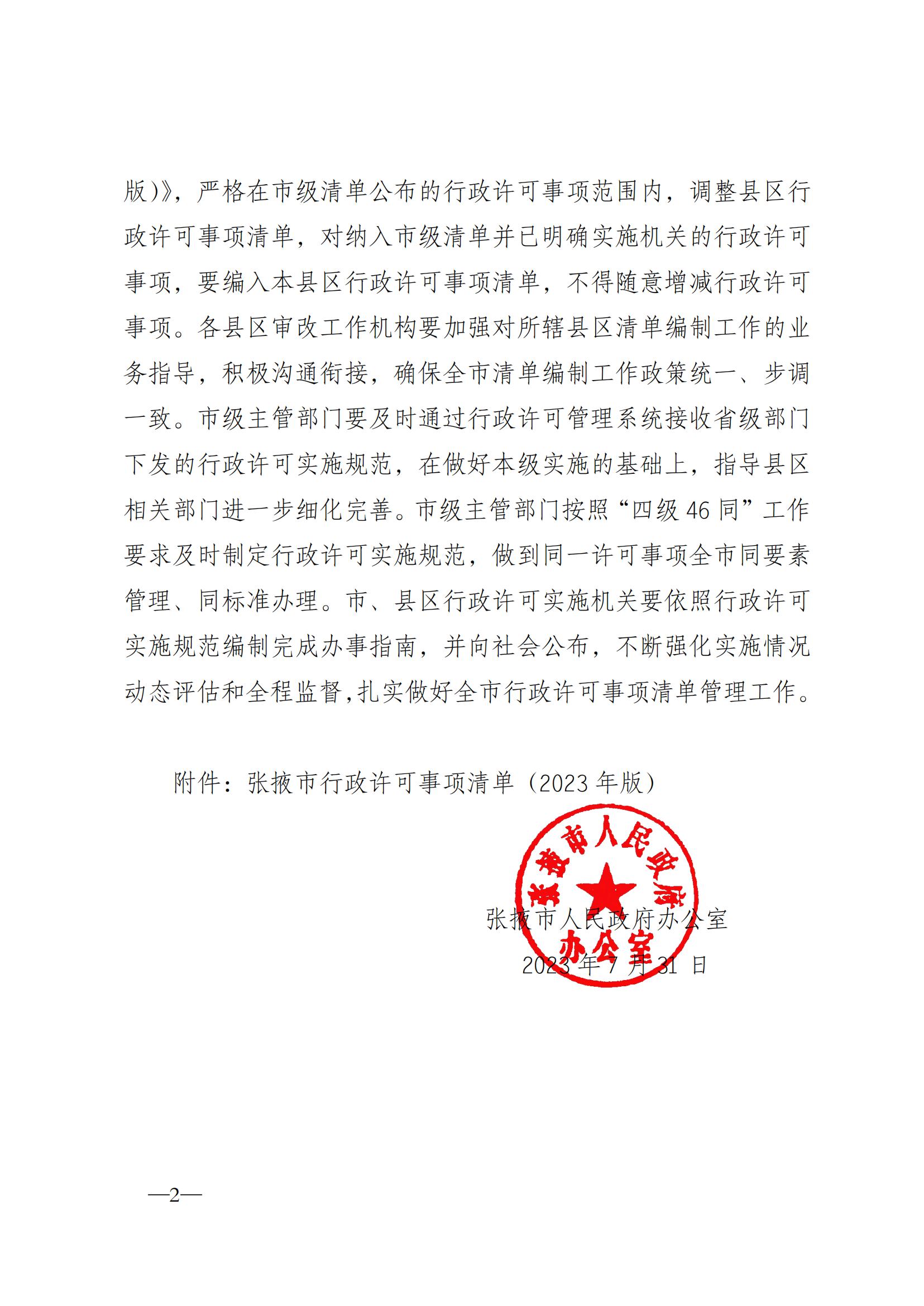 张掖市人民政府办公室关于公布张掖市行政许可事项清单(2023年版)的通知
