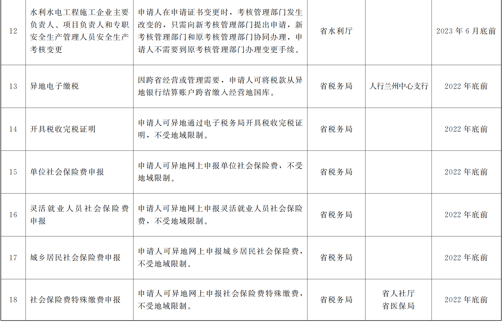 一、高标准推进实施新增“跨省通办”事项。各地各有关部门要在继续深入落实《国务院办公厅关于加快推进政务服务“跨省通办”的指导意见》(国办发〔2020〕35号)的基础上,按照国办发34号文件部署要求,以利企便民为导向,细化具体推进落实举措,不断扩大“跨省通办”事项范围。省直有关部门和中央在甘有关单位要认真对照政务服务“跨省通办”新增任务清单(见附件)部署的22项新增“跨省通办”事项,严格按照明确的应用场景、责任分工和完成时限抓好落实;要主动加强与国务院有关部门的沟通衔接,按照国家层面统一部署要求,规范事项名称、办理流程等要素,同步指导市级行业部门将相关政务服务事项纳入本级政务服务中心办理。各市(州)、兰州新区要聚焦关中平原、兰州—西宁等城市群、都市圈一体化发展、主要劳务输入输出地协作、毗邻地区交流合作等需求,积极与兄弟城市开展政务服务“跨省通办”合作,科学推动医疗、养老和市场主体登记注册等更多与企业发展、群众生活密切相关的高频政务服务事项“跨省通办”;要继续加强与相关省份对接协作,扩大“丝路通办”、黄河流域省会城市商事登记“跨省通办”等合作范围。